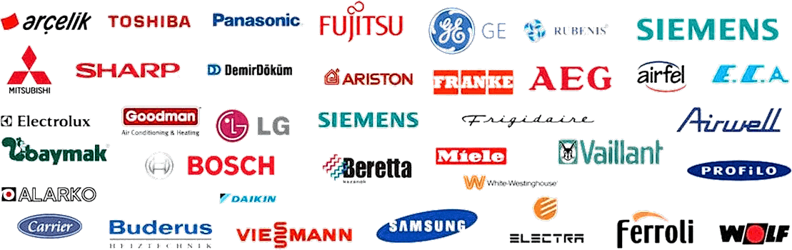 Tronic, Samui, Mitsubishi, Arçelik, Beko, Daikin, LG, Vestel, Airfel klima servisi, Bosch, Sharp, Ferroli, Siemens, Samsung, Alarko, inverter, Profilo, Mitsubishi, Toshiba, Baymak klima servisi, Viessmann, Sigma, Demirdöküm, Sunny, Elektrolüx, Vaillant, Fujitsu, Baxi, Diamond Elektric, Regal, Fuji Electric, York, Panasonic, Kelon, General Elektric, Seg, Rubenis, VRF, Altus, White Westinghouse klima